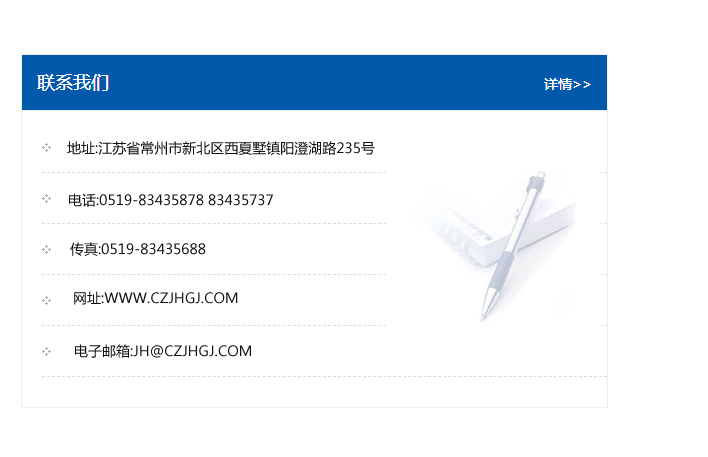 地址:常州市新北區友邦商務大廈1幢16、17層  電話:0519-85101652  傳真:0519-85112595  郵編:213022  網址:www.cz-jiayue_cn.fsdsjm.com  郵箱:xiajifengaa@163.com